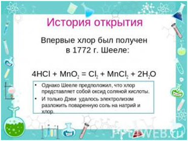 хлор был получен в 1772 г. Шееле, описавшим его выделение при взаимодействии